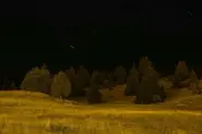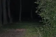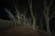 Landscape features include trees, which either have shed their leaves for the winter or are evergreens; and wet tarmac, which reflects ambient light (such as moonlight).